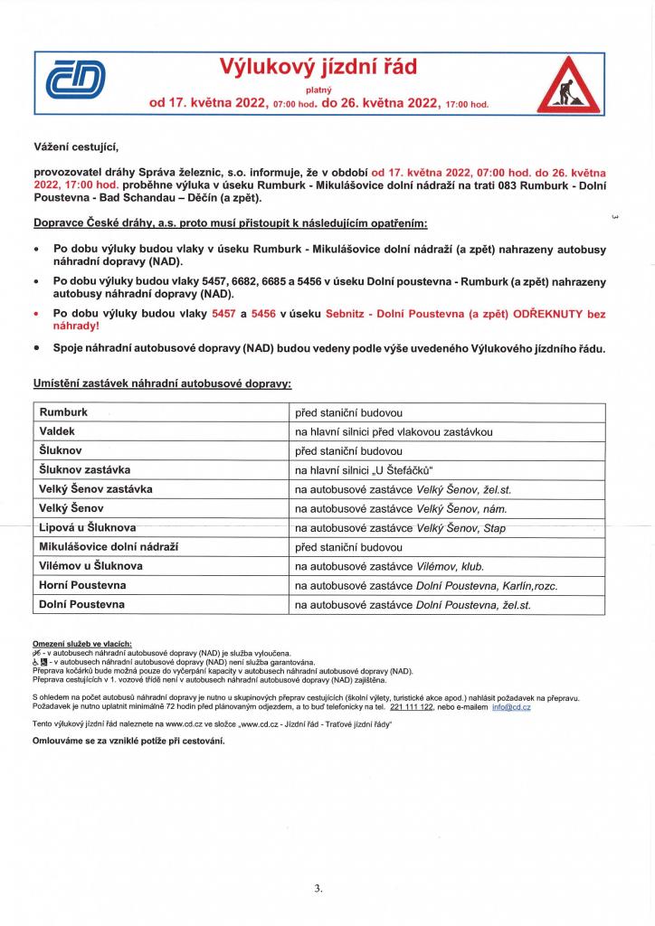 ČD - Výlukový jízdní řád od 17.5.2022 do 26.5.2022