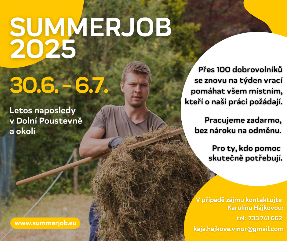 V Dolní Poustevně se letos naposledy koná projekt Summer Job, do kterého se zapojí přes 100 dobrovolníků. Ti nabídnou svou pomoc místním obyvatelům, kteří ji skutečně potřebují. Práce je vykonávána bez nároku na odměnu a probíhá v týdnu, kdy se dobrovolníci budou snažit přispět co nejvíce. V případě zájmu o pomoc se mohou zájemci obrátit na Karolínu Hájkovou na telefonním čísle 733741662 nebo na email kaja.hajkova.vinoregmail.com.