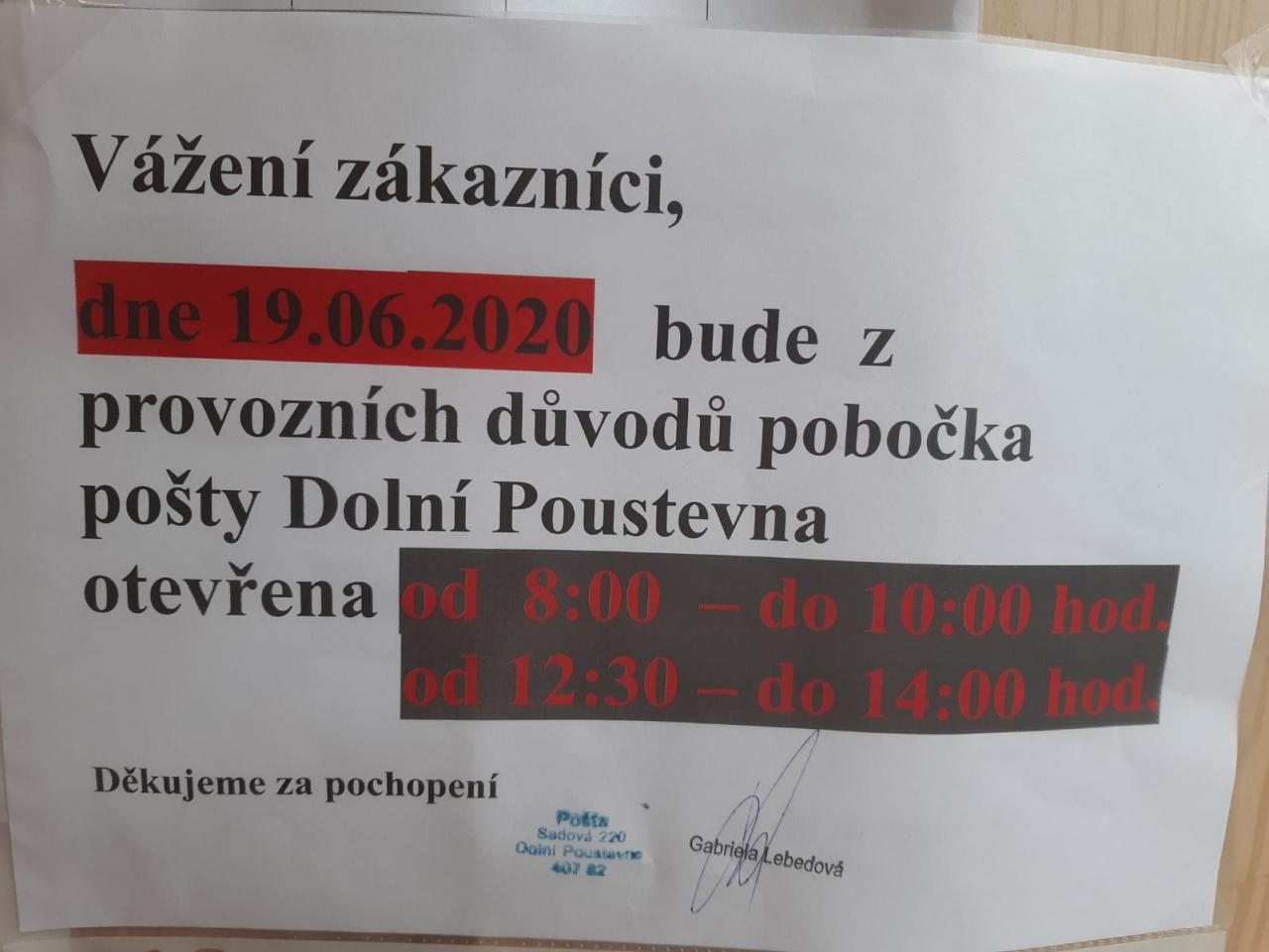 Dočasná změna otevírací doby na poště v Dolní Poustevně.