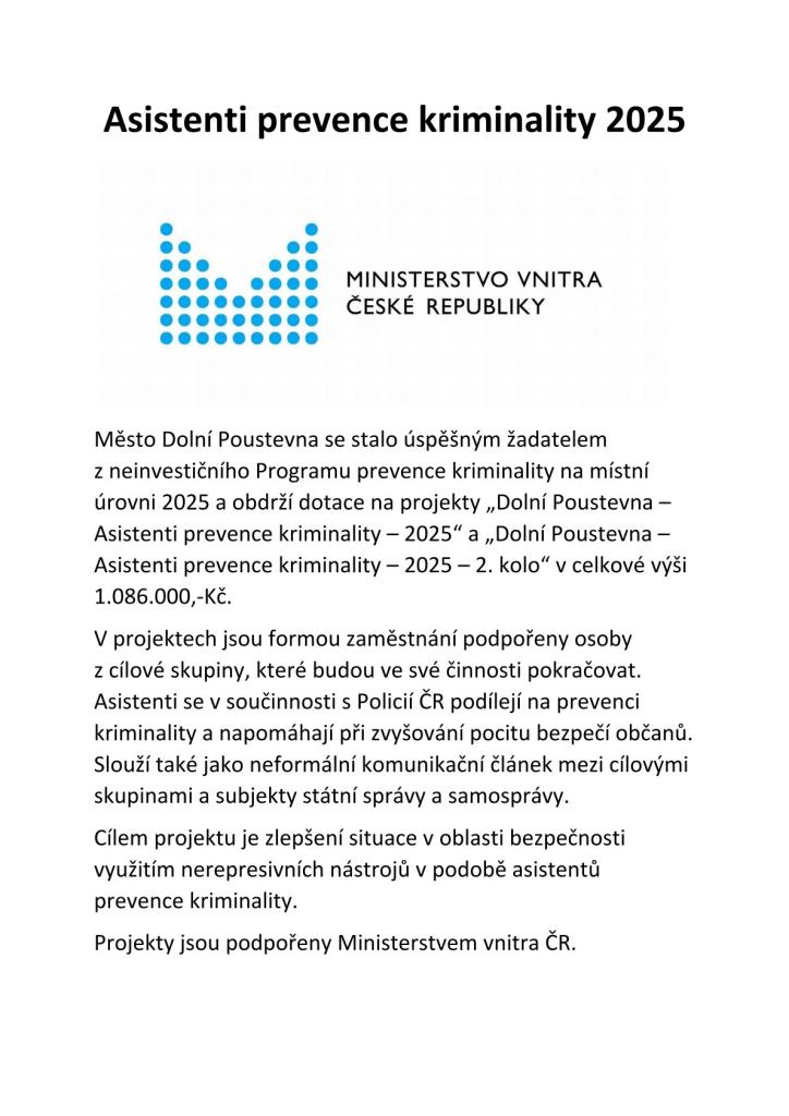 Město Dolní Poustevna se stalo úspěšným žadatelem z neinvestičního Programu prevence kriminality na místní úrovni 2025 a obdrží dotace na projekty „Dolní Poustevna–Asistenti prevence kriminality–2025“ a „Dolní Poustevna–Asistenti prevence kriminality–2025–2. kolo“ v celkové výši 1.086.000,-Kč.
