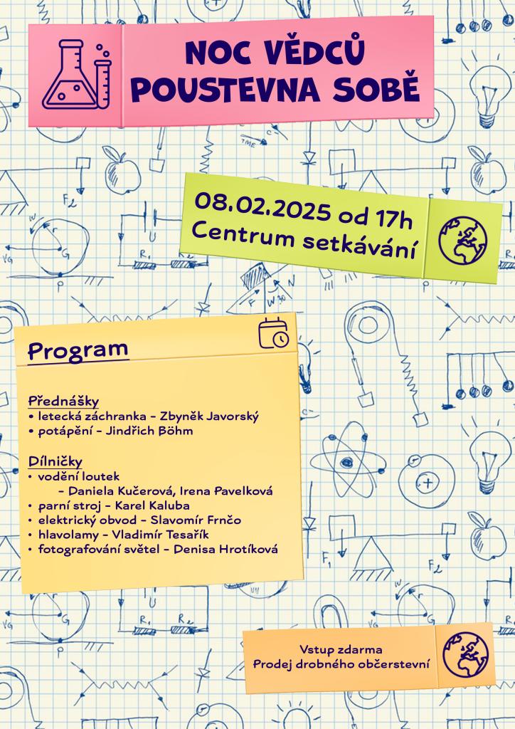 Dne 8. února od 17 hodin se uskuteční setkání s bohatým programem přednášek a dílniček. Na akci vystoupí Zbyněk Javorský s přednáškou o letecké záchranné službě a Jindřich Bóhm s tématem potápění. Dílničky nabídnou aktivity jako vodění loutek s Danielou Kučerovou a Irenou Pavelkovou, parní stroj s Karlem Kalubou, elektrický obvod se Slavomírem Frnčem, hlavolamy s Vladimírem Tesaříkem a fotografování světel s Denisou Hrotíkovou. Vstup je zdarma a bude zajištěn prodej drobného občerstvení.