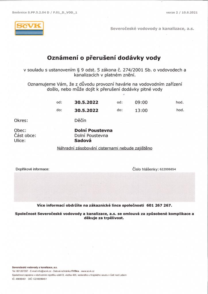 Oznámení o přerušení dodávky vody