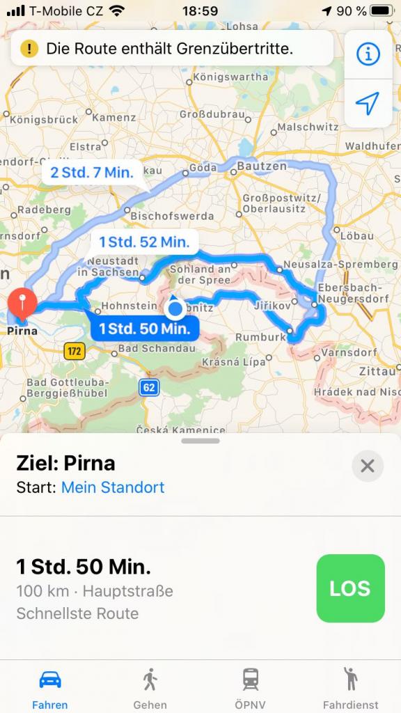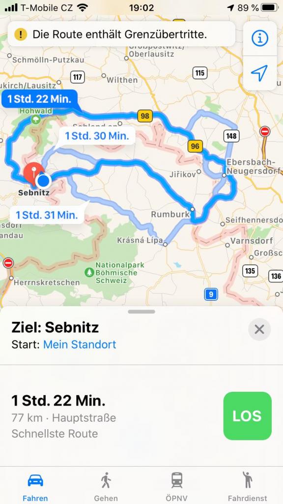 Pro názornou ukázku předkládáme prodloužení vzdálenosti, přes Dolní Poustevnu tvrá cesta do Sebnitz 3 minuty a do Pirny 40 minut.
