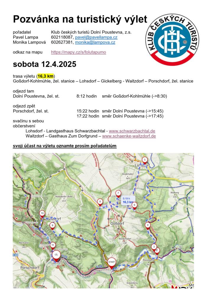 Klub českých turistů Dolní Poustevna pořádá výlet na trase dlouhé 16,3 km, který se koná 12. dubna 2025. Účastníci se sejdou na vlakové stanici Dolní Poustevna a projdou malebnými lokalitami jako jsou Lohsdorf, Gickelberg a Porschdorf. Nezapomeňte si vzít svačinu a přihlásit se u pořadatelů.