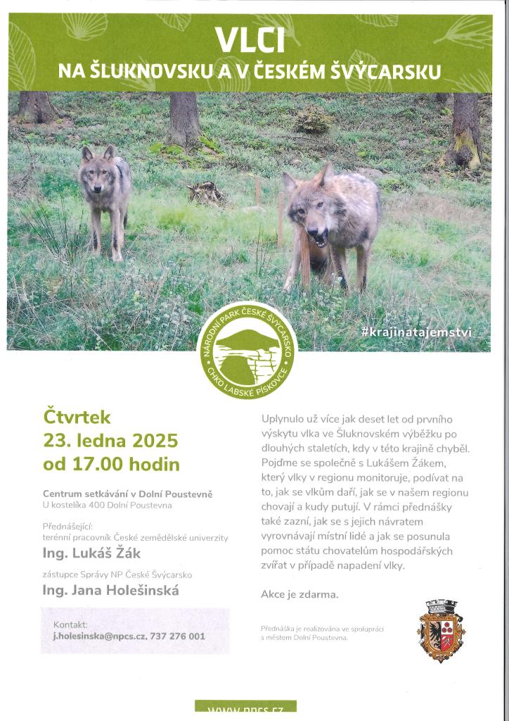 Zveme vás na přednášku o vlcích ve Šluknovsku a Českém Švýcarsku, která se koná 23. ledna 2025 od 17:00 v Centru setkávání v Dolní Poustevně. Přednášející Lukáš Žák a Jana Holešinská se zaměří na monitoring vlků, jejich chování a putování v regionu, i na reakce místních obyvatel a státní podporu chovatelům. Akce je pořádaná ve spolupráci s městem Dolní Poustevna a je zdarma.