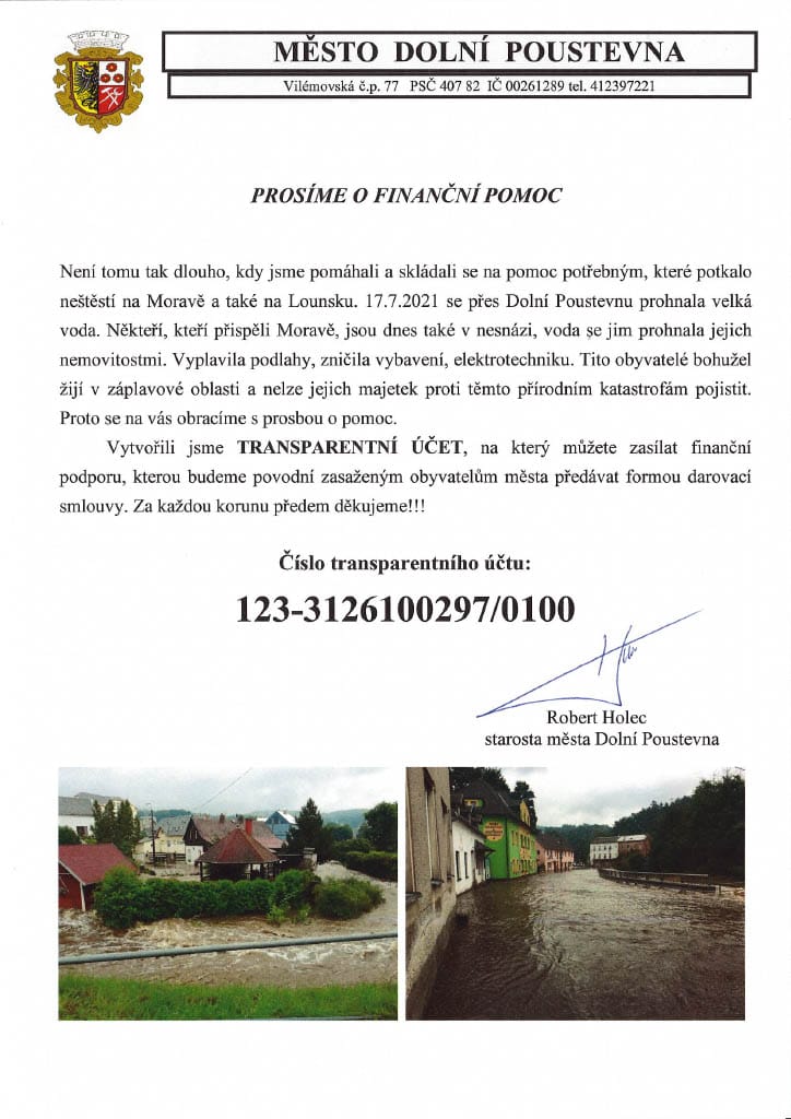 Vytvořili jsme TRANSPARENTNÍ ÚČET, na který můžete zasílat finanční podporu, kterou budeme povodní zasaženým obyvatelům města předávat formou darovací smlouvy. Za každou korunu předem děkujeme!!!