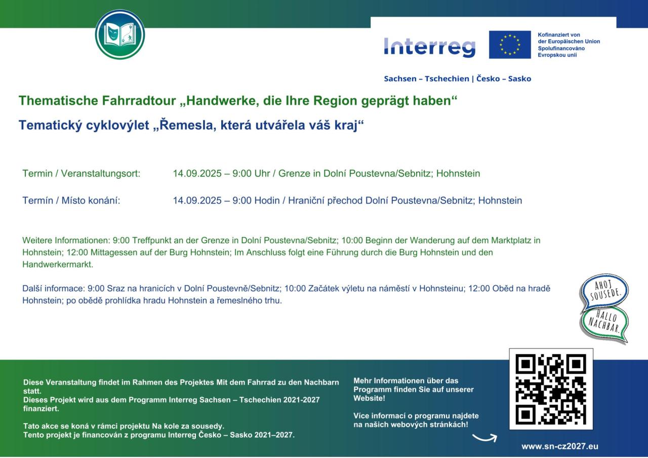 V neděli 14. 9. proběhla již třetí společná akce v rámci projektu „Na kole za sousedy / Mit dem Fahrrad zu den Nachbarn“. Konkrétně se jednalo o společný česko-německý cyklovýlet s tematickým zaměřením „Řemesla, která utvářela váš kraj“.