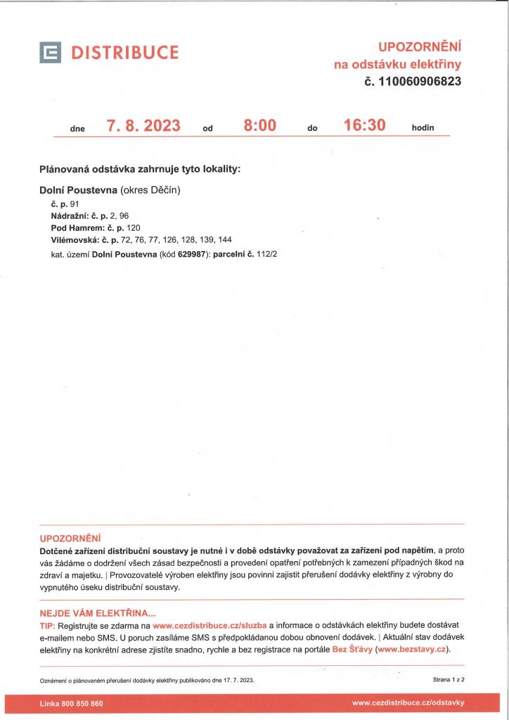 Aktuality - Upozornění na odstávku elektřiny