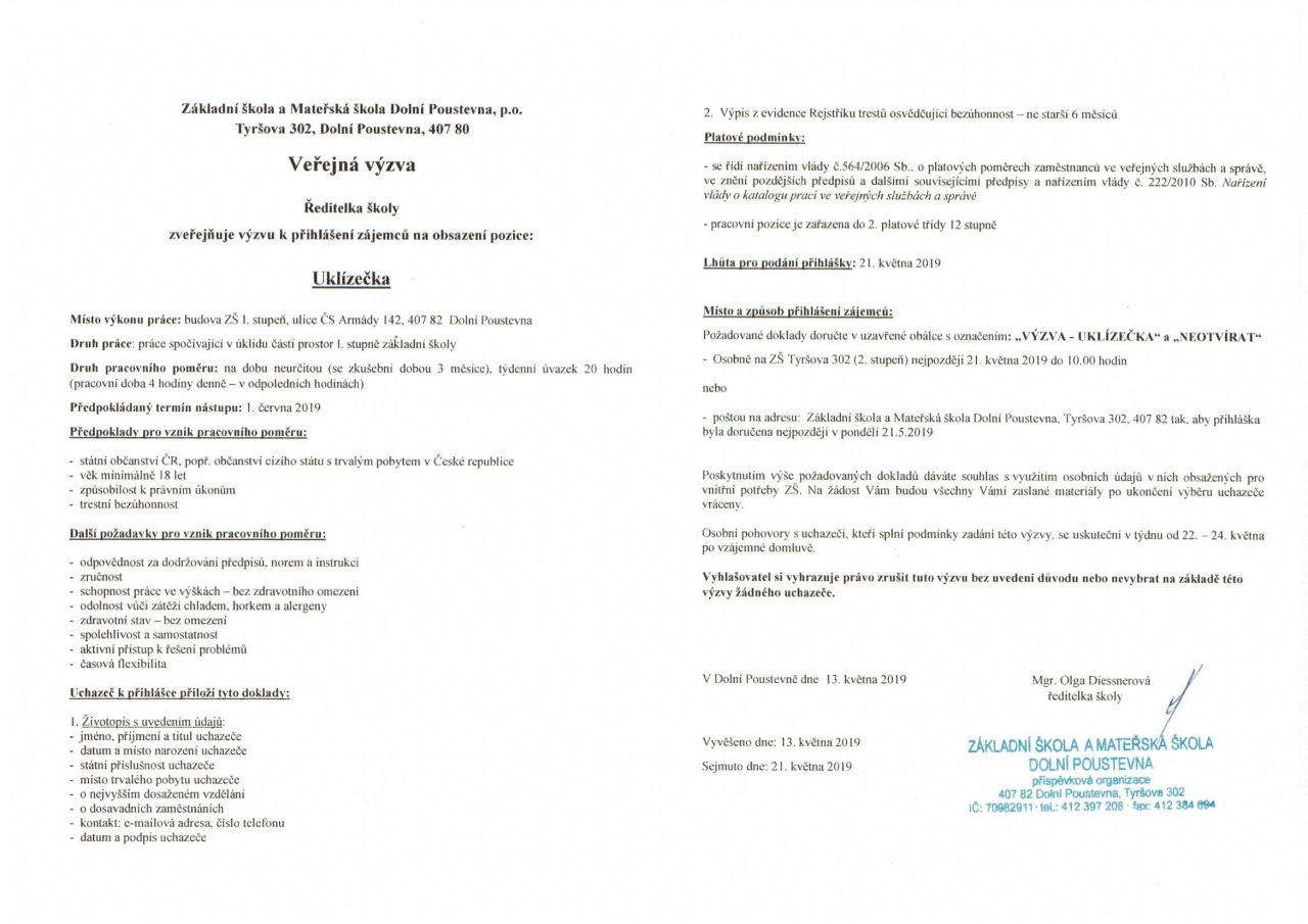 Veřejná výzva, uklízečka I.stupně ZŠ