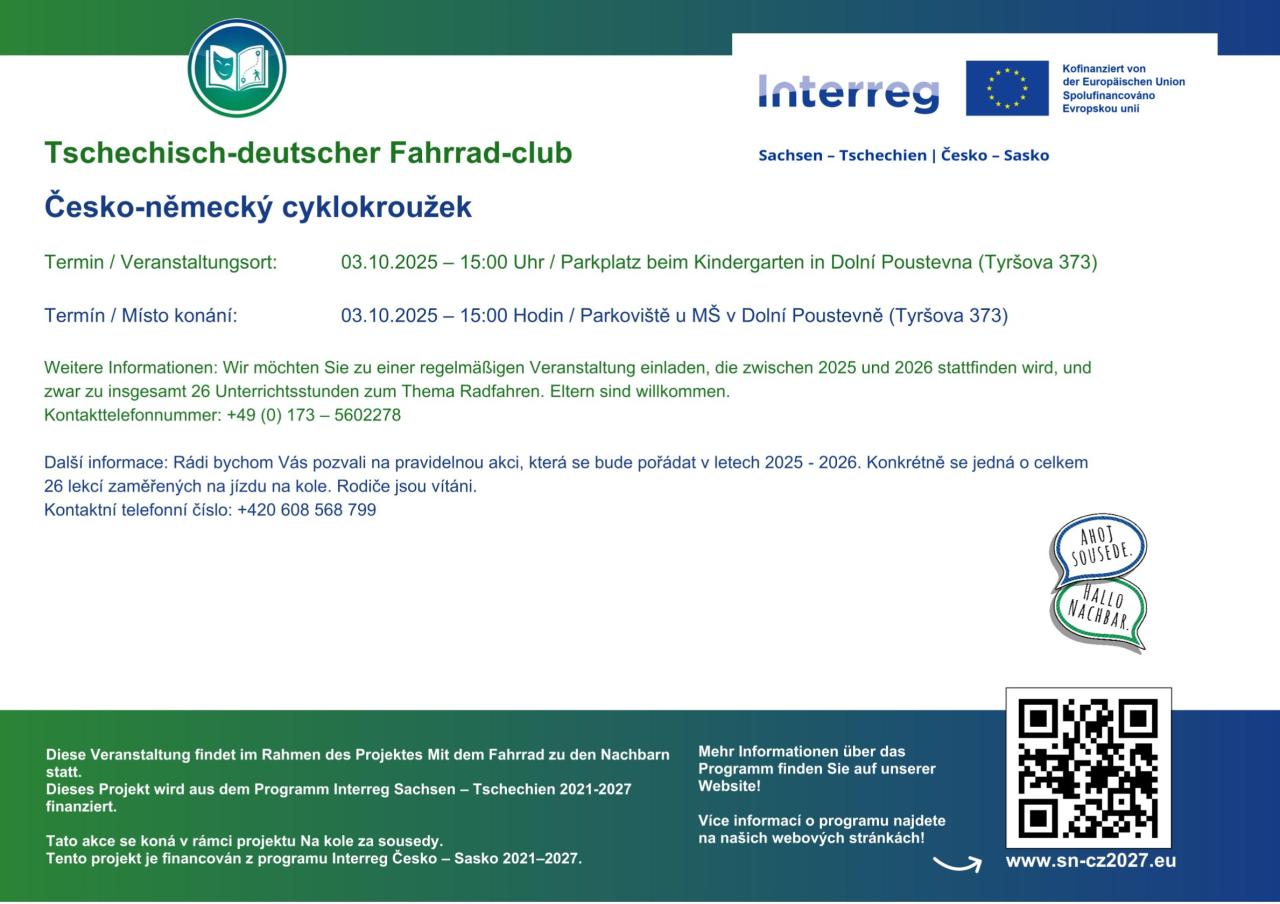 Další lekce cyklokroužku se uskuteční 3. října od 15:00 hodin s místem setkání na parkovišti u MŠ v Dolní Poustevně.