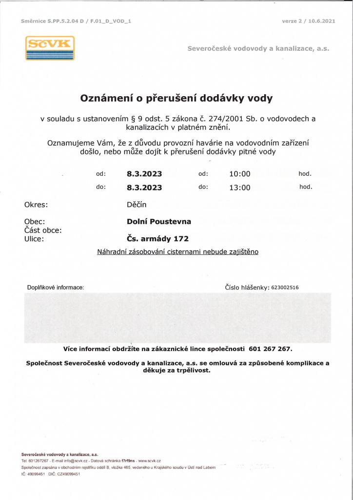 Oznámení o přerušení dodávky vody