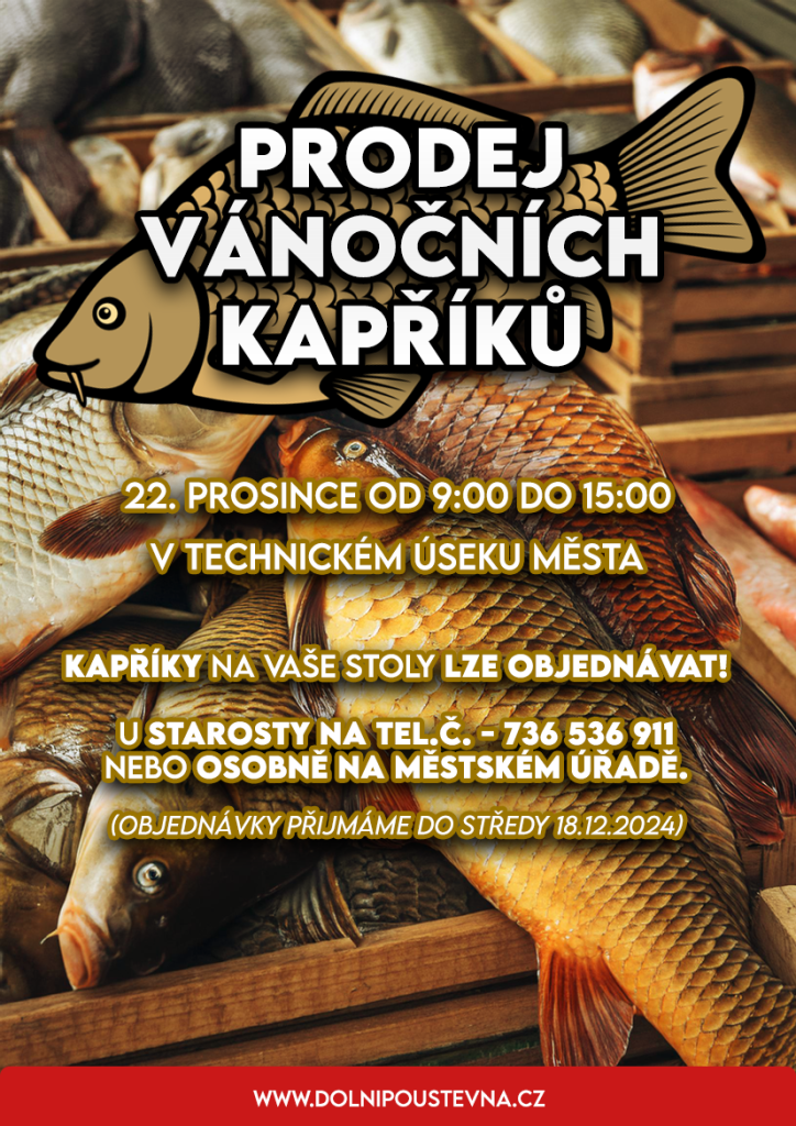 Zájemci mohou zakoupit čerstvé kapry na vánoční svátky. Prodej probíhá v technickém úseku města a je doporučeno zajistit si kapra co nejdříve na tel. 736 536 911 nebo osobně na městském úřadě. Objednávky přijímáme do středy 18.12.2024