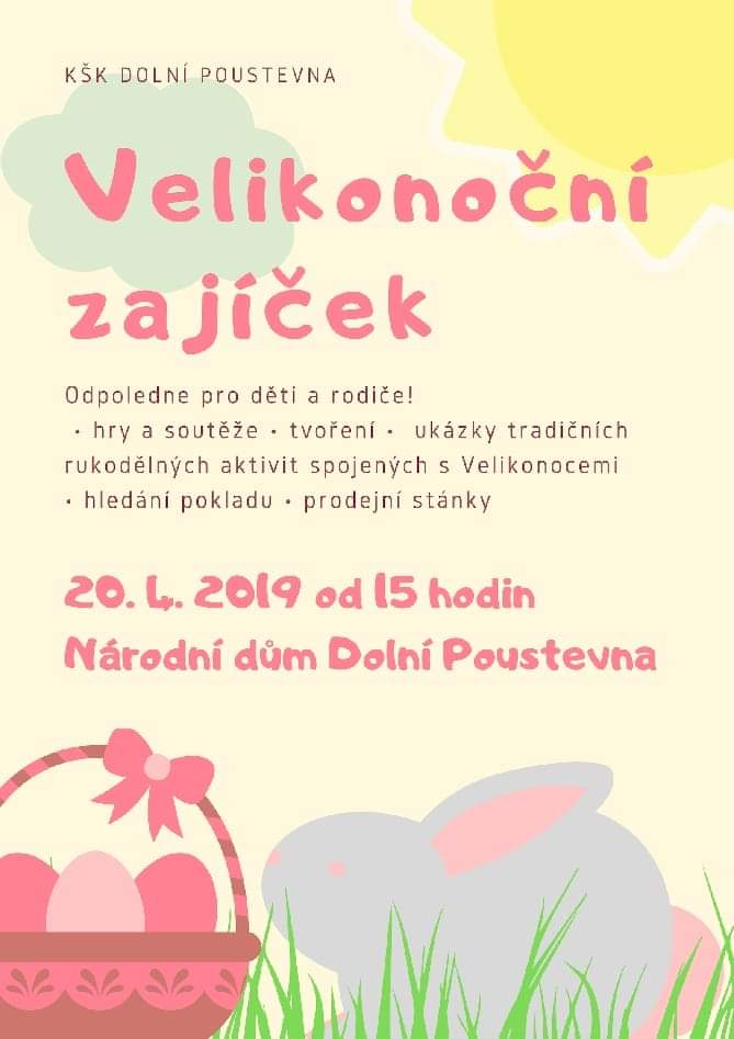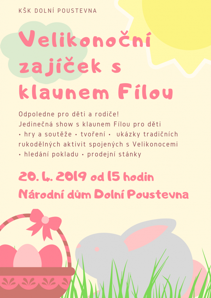Srdečně vás zveme na zábavnou a tvořivou akci pořádanou KŠK při Městě Dolní Poustevna. O zábavu pro děti se postará Klaun Fíla a možná přijde i "Zajíček". Ostatní návštěvníci si mohou vyzkoušet různé velikonoční tradice a tvoření (malování vajíček voskem, pletení pomlázky, zdobení perníčků, decoupage, obháčkovávání a barvení vajec, apod.). Na akci si bude možné v prodejních stáncích zakoupit nejen velikonoční výrobky místních spolků. Vstupné na akci zdarma.